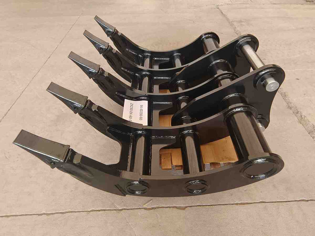 Excavator Rakes have a curved profile for efficient digging and screening of debris such as rocks and tree roots, making it possible to remove roots during site preparation. And it can cooperate with Thumbs to expand its processing functions. The rake with pointed tips, which can provide maximum penetration and stays sharp for extended wear life.